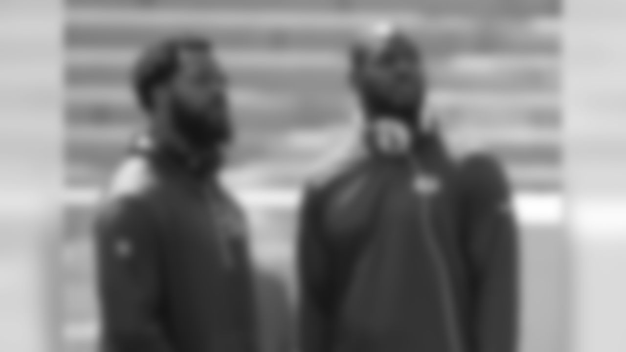 Green Bay Packers' Martellus Bennett, right, talks to his brother Seattle Seahawks' Michael Bennett before an NFL football game Sunday, Sept. 10, 2017, in Green Bay, Wis. (AP Photo/Mike Roemer)