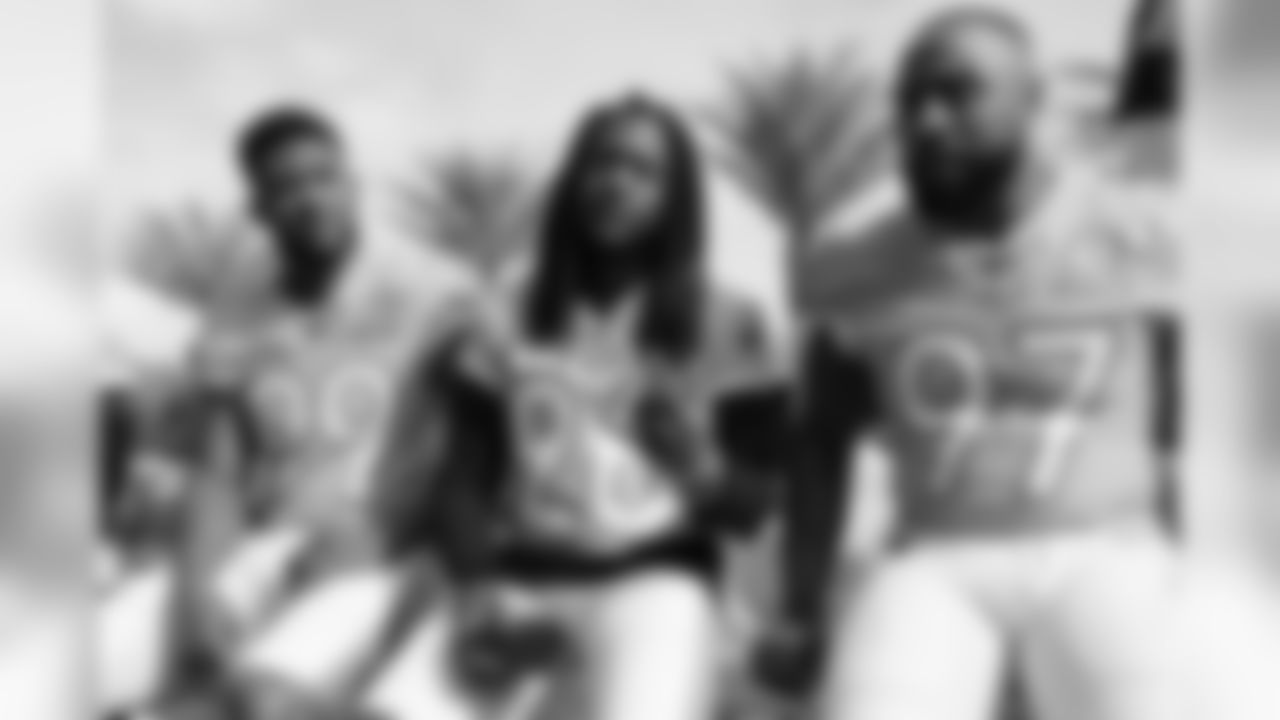 Minnesota Vikings defensive end Danielle Hunter (99), Seattle Seahawks cornerback Shaquill Griffin (26) and Minnesota Vikings defensive end Everson Griffen (97) pose for a photo after team portraits, Thursday, Jan. 23, 2020 in Orlando, Fla. (Cooper Neill/NFL)