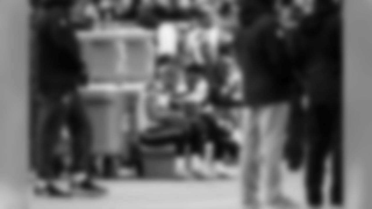 Seattle's Tyler Lockett and Tre Madden review the previous drive on the sidelines.