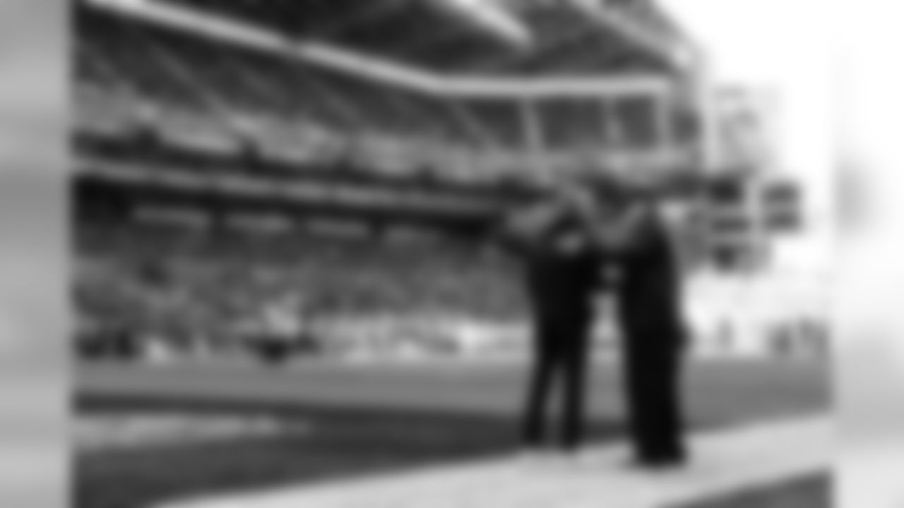 Seahawks head coach Pete Carroll and team owner Paul Allen shake hands on the field before the game.
