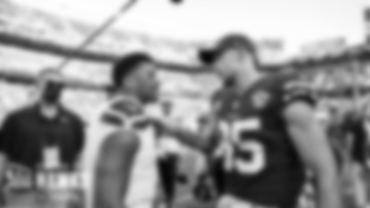 Seahawks wide receivers DK Metcalf and Freddie Swain greet each other on the field during early pregame.