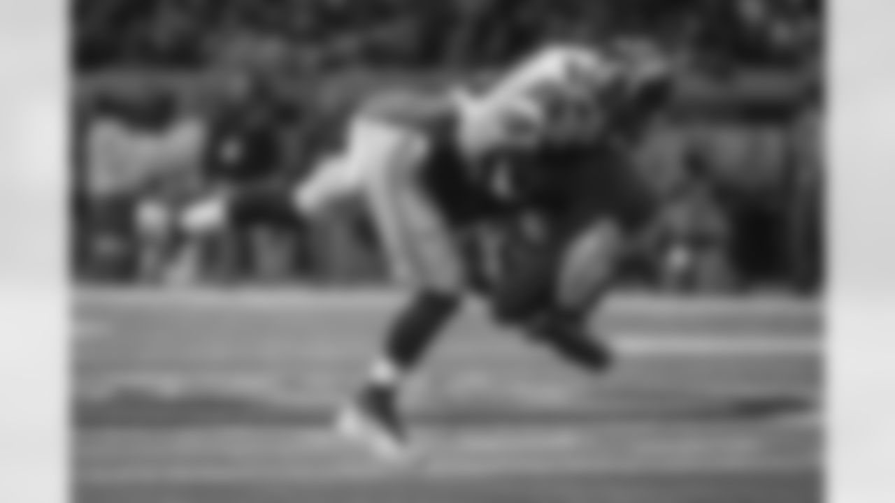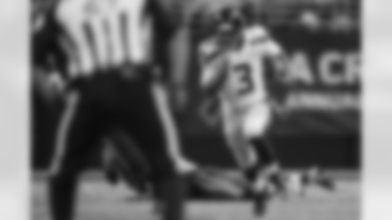 Russell Wilson leaves the Rams in his wake as he runs up the left side for a 52-yard gain. Wilson became the first player in NFL history to pass for over 300 yards and rush for over 100 yards in a single game.