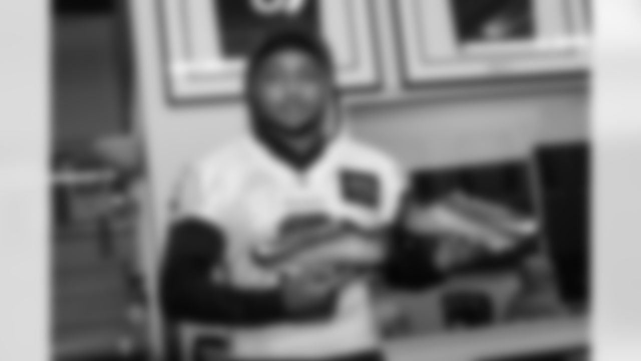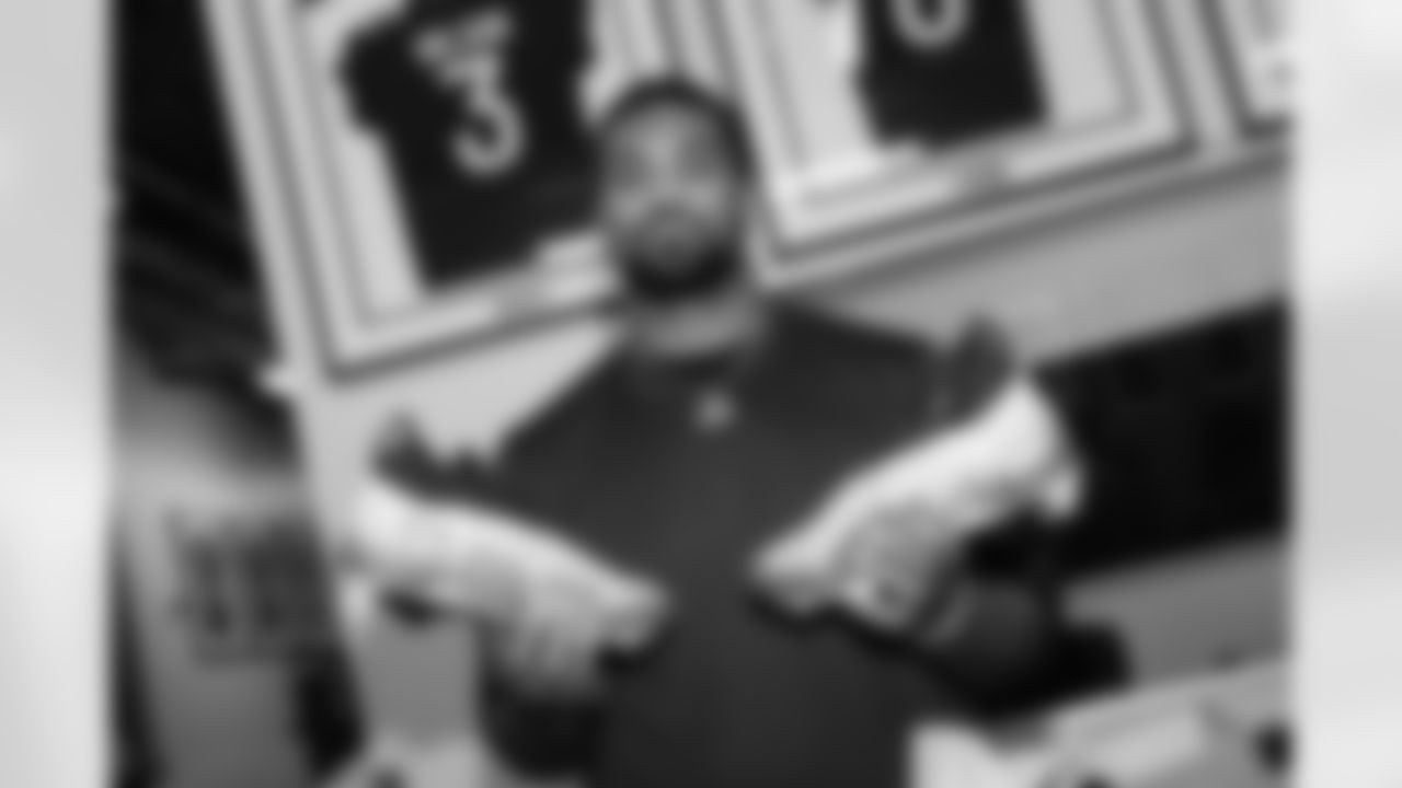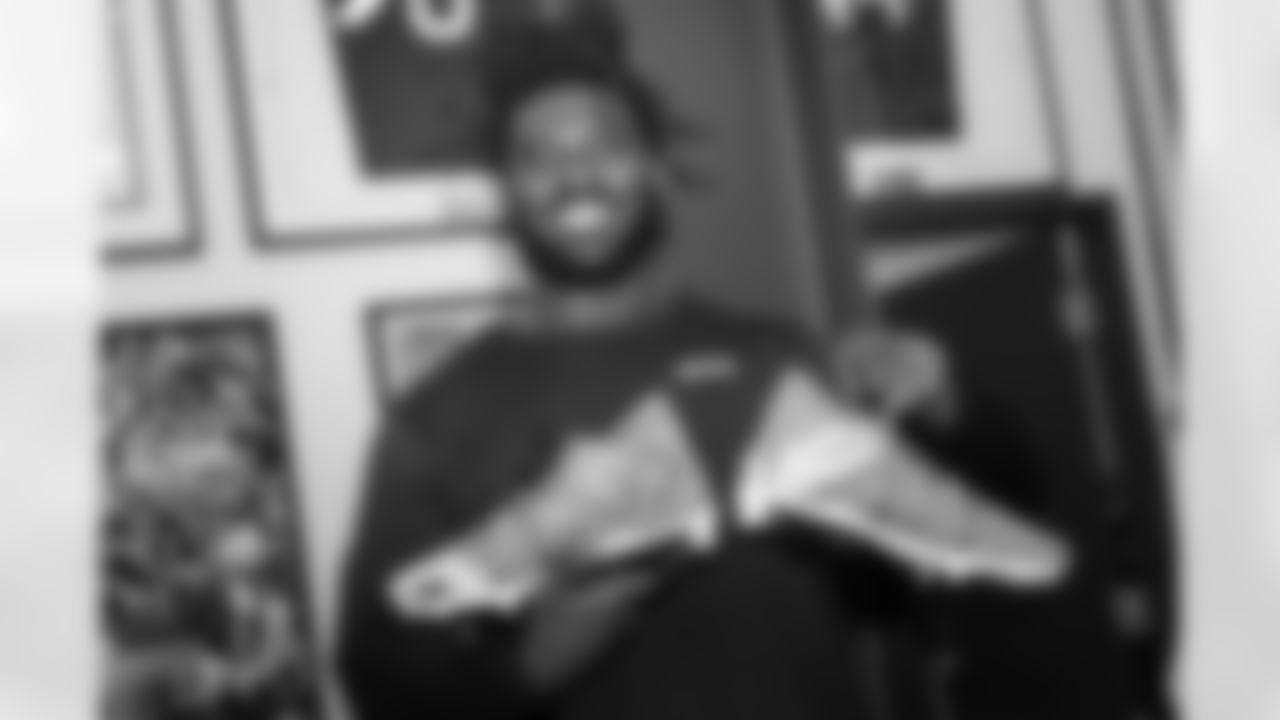 Seahawks tackle Raiqwon O'Neal (79) unboxes their My Cause My Cleats that will be worn in the Week 13 Thursday Night Football matchup with the Dallas Cowboys.