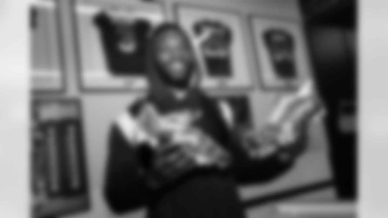 Seahawks cornerback Michael Jackson (30) unboxes their My Cause My Cleats that will be worn in the Week 13 Thursday Night Football matchup with the Dallas Cowboys.