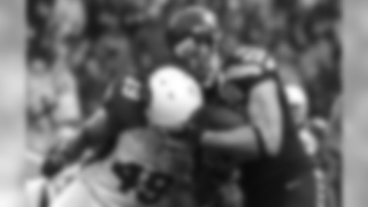 Seattle Seahawks tight end Zach Miller (86) is hit by Arizona Cardinals strong safety Rashad Johnson (49) as he scores on a 24-yard touchdown reception during the second quarter of an NFL football game in Seattle, Sunday, Dec. 9, 2012. (AP Photo/Stephen Brashear)