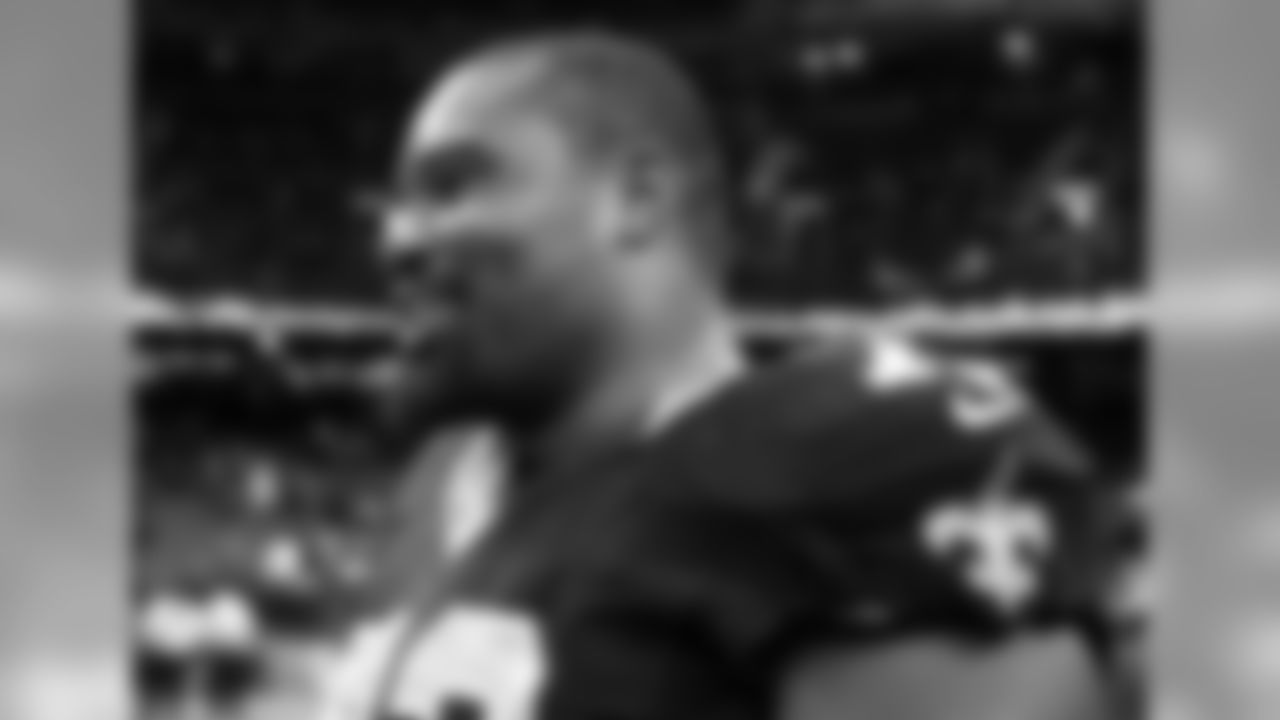 New Orleans Saints guard Jahri Evans (73) walks onto the field during player introductions before an NFL football game in New Orleans, Sunday, Sept. 20, 2015. (AP Photo/Jonathan Bachman)