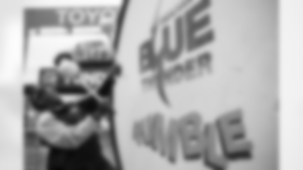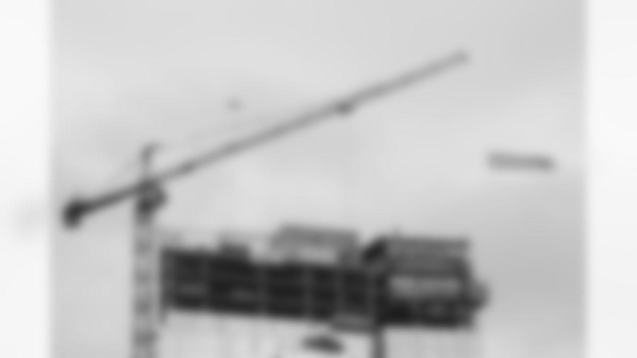 Construction workers raise a truck painted with a seahawk to the roof of Stadium Place Apartments.